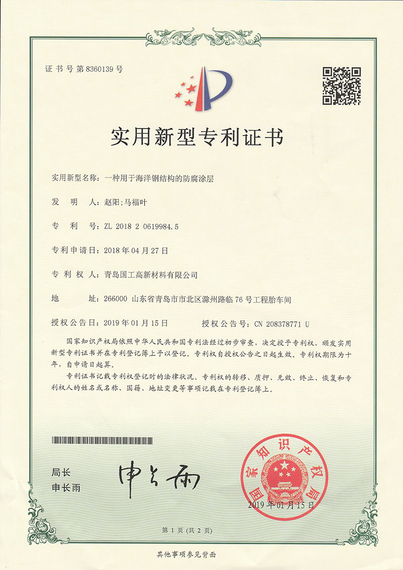 一種用于海洋鋼結構的防腐塗層 - 榮譽資質 - 青島湛江鑫本航空航天集团****